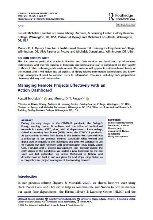 Michalak, R. & Rysavy, M. (2018). Online onboarding: Library workplace training in a trilingual interactive online asynchronous environment. Ifenthaler, D. (Ed.) In Digital Workplace Learning - Bridging Formal and Informal Learning with Digital Technologies. New York: Springer. here